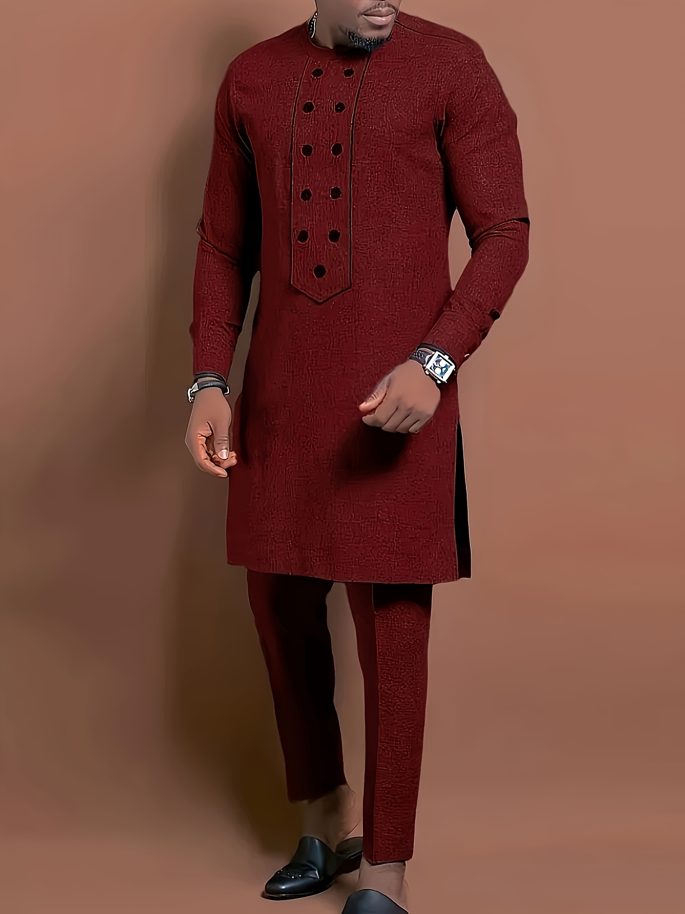 The top and trousers are made from 100% polyester woven fabric, providing a smooth texture and structured appearance. Designed with a loose fit type, this suit offers a relaxed wearing experience suitable for casual occasions.